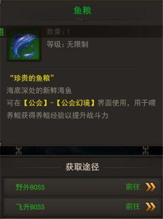 喂养鲲的鱼粮可以通过野外BOSS和飞升BOSS获得,其中飞升BOSS可以获得豪华鱼粮!快看,小编通过野外BOSS获得鱼粮了呢!
