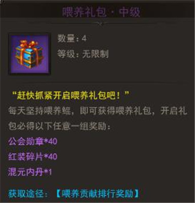其中最重要的就是喂养礼包,这个礼包中包含了增加内功属性的超强内丹!