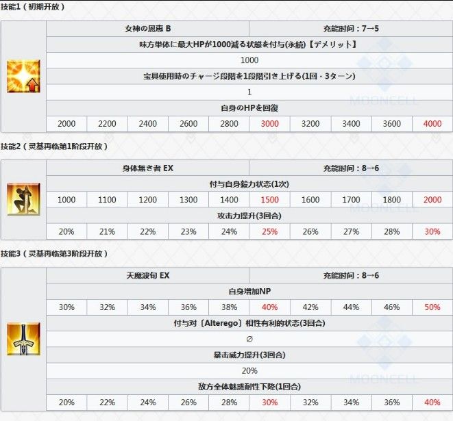 3技能CD8,自充50%,对alterego职介变为克制伤害持续3T,暴击威力提升20%持续3T,敌方全体魅惑耐性下降1T。