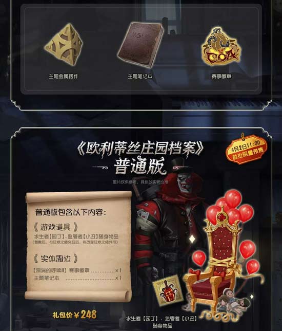 第五人格一周年生日会,周年庆超豪华线下礼包——《欧利蒂丝庄园档案》将于4月2日11:30开启秒杀预售,共有三个版本礼包精致,诚意满满。