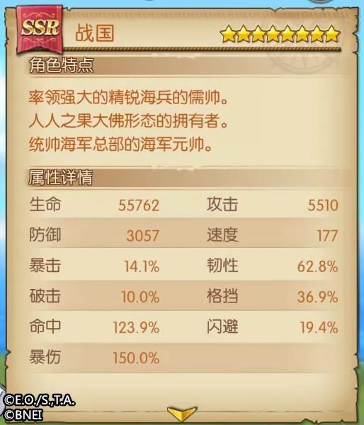 海军元帅:战国自身提高攻击力、防御力与血量,最多增加30%。同时可令阵容中的海军获得伤害减免与伤害提升。最多减免10.5%受到的伤害,提升10.5%造成的伤害。