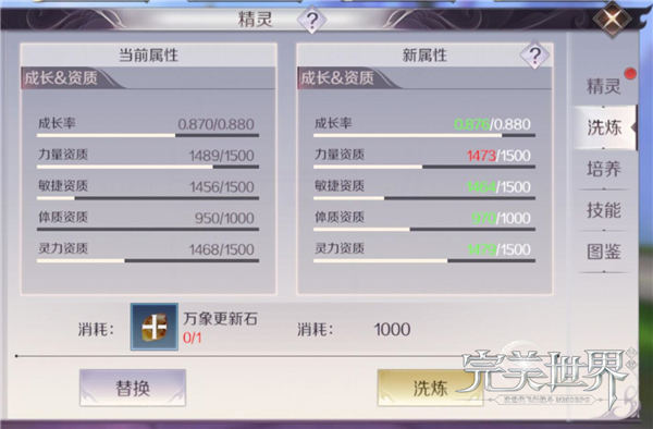 成长率也是比较重要的,因为成长率能非常直接的影响精灵所有资质的加成效果,如果说我们洗炼的时候,新的属性跟我们原有的相差无几,那么着重看的就是成长率。