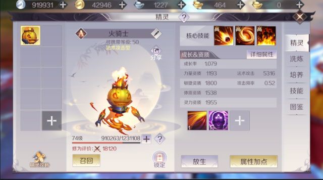 小编目前使用的是A级的火骑士,74级也有近2万的战力了,身上也打了2个技能,后面再提高几级,洗一下资质,到2万修为应该不成问题。