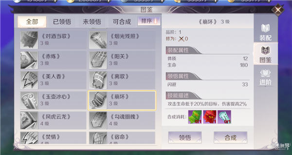 细心的小伙伴们应该发现了天书系统的一个特点,那就是低等级的天书(针对一级和二级)基本都是法系加成,这对以物理输出为主的羽芒来说很不友好。因此,我们只把低等级的天书当作过度即可,选择增加体质和生命值的天书,比如《满江红》、《捻花一笑》、《塞下》和《杀破狼》。这里针对低等级的天书不再进行过多的讲解。