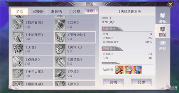 同样结合羽芒的特点,按照刚才的思路,在5、6级的天书搭配上,我推荐:《天残地缺》、《波浩淼》《冰夷》和《坐忘禅》。这几本天书都能够减少普攻间隔,而且还有着不错的附加生命值等属性的加成。同时,像《天残地缺》、《冰夷》和《坐忘禅》,前者能够在攻击时概率提高自己的移动速度,后两者能够对敌人概率施加控制效果。这些技能都能够在副本中为羽芒提供更好的输出环境,更好的进行走A。
