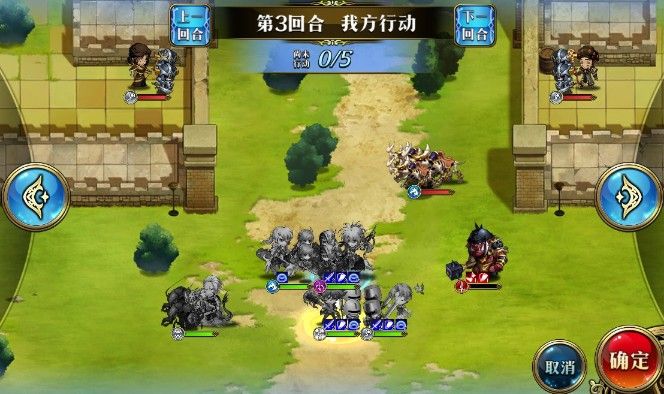 开局加BUFF往上移动,2回合雷丁神卫反击骑兵,利昂骑士精神打掉左上兽人。