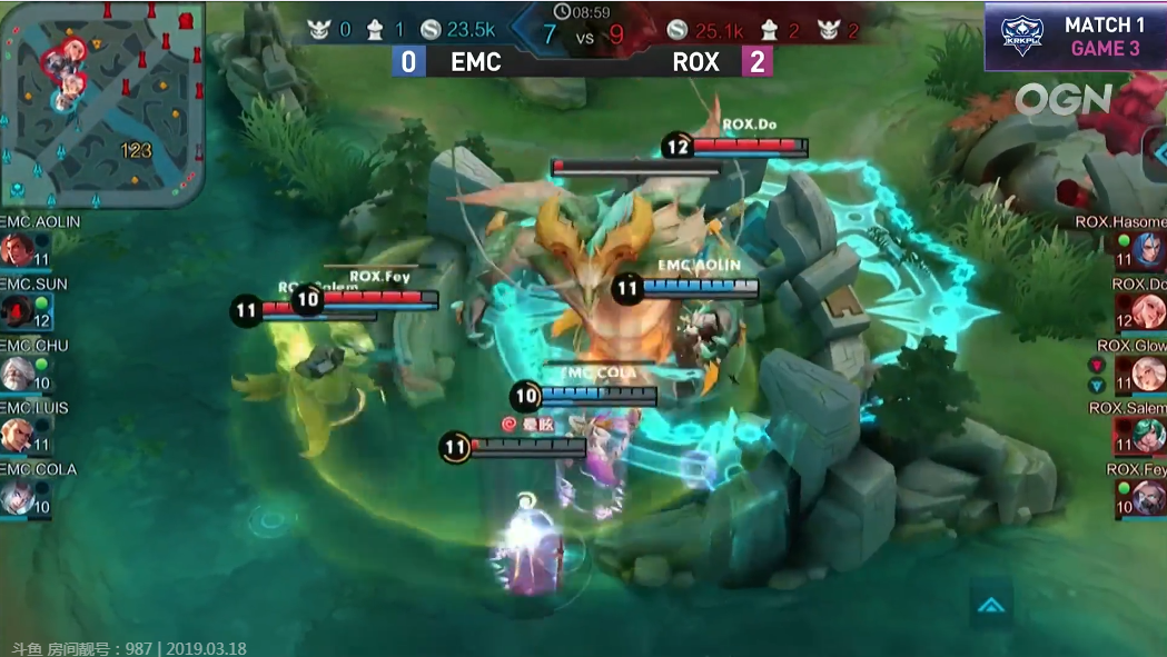 EMC前期遭遇ROX四人入侵红Buff,拉扯过后ROX拿下三Buff优势;虽然4分钟EMC依靠苏烈和公孙丽扳回一城,但面对ROX的疯狂进攻8分钟时外塔全部告破;由于获得野区和远古生物的资源优势,ROX孙尚香装备提前成型,带领队友顺利推进拿下水晶。