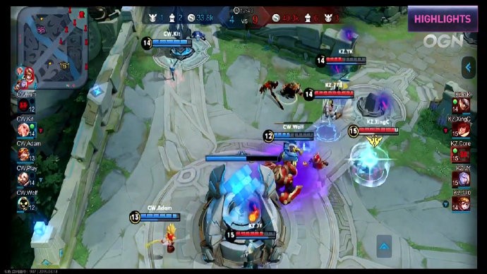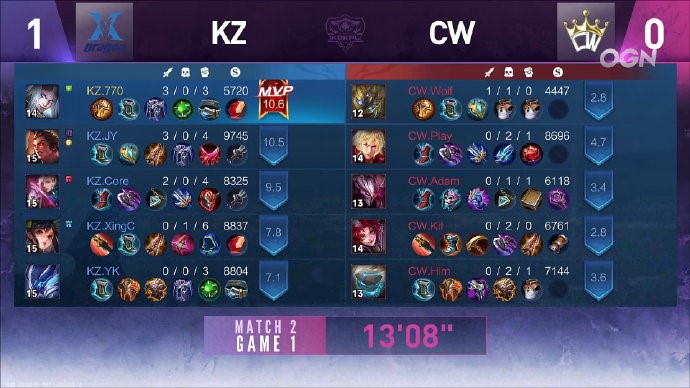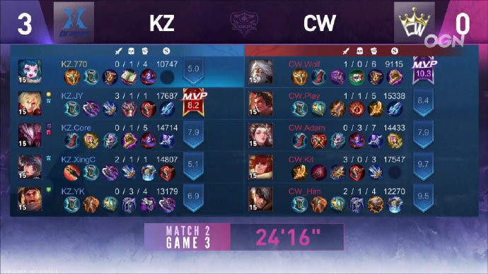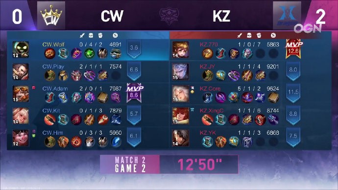 CW劣势持续到16分钟,CW吕布关键时刻完美大招,逆转团战,击杀敌方两人,随后拿下主宰,双方你来我往陷入僵持。21分钟KZ依靠站位优势击杀主宰和黑暗暴君,把握时机击杀CW一人,最终推掉水晶结束战斗,以3:0的成绩雪耻并拿下首胜。