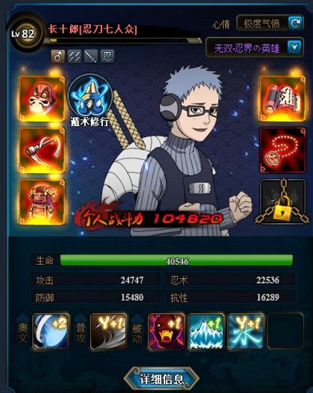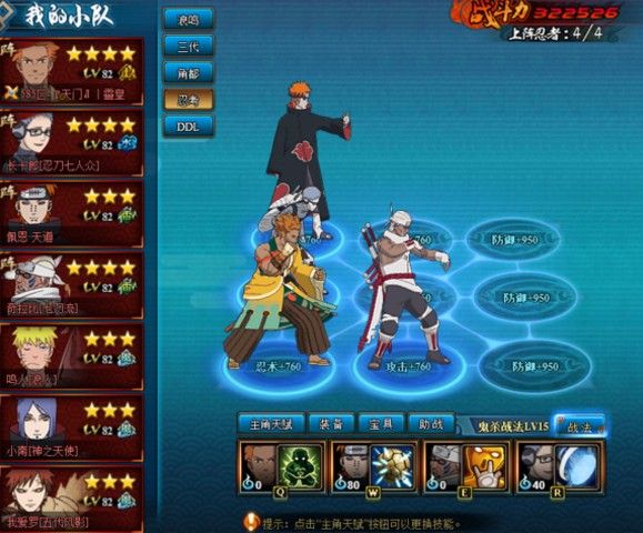 战力站位技能如图。忍者要求天道、长十郎突破,技能选择看贴图。长十郎一号装备,天道二号装备。奇拉比血最少。