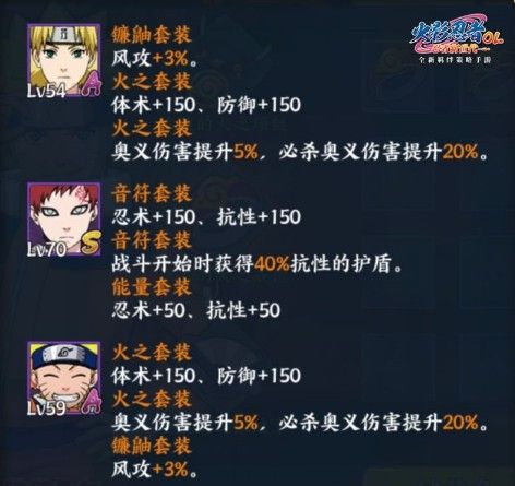 我爱罗【少年篇】选用4件音符套装来增加开局护盾的厚度,而鸣人【螺旋丸】则是使用火之套装,由于这个套装6件套属性提供的是力量和体质属性,在这里发挥不了太大作用,因此放弃并选择了镰鼬套装的2件属性,以此增加风攻。