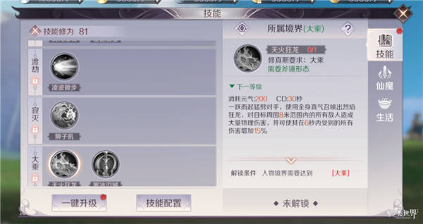 在后期必杀技的设置上,渡劫和寂灭期,我们能够分别掌握提高移速并免控的凌波微步技能和眩晕周围敌人3秒的狮子吼技能,有了这两个技能,武侠的输出环境得到了进一步的优化。对于大乘境界的终极必杀技,斧形态的天火狂龙和枪形态的寒冰刃域,前者能够在一瞬间打出巨额伤害,而后者兼具一定的控制效果,因为两者都会消耗200元气,因此我们要根据不同的情况进行抉择。