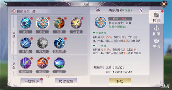 在筑基阶段,我们只能使用斧形态进行攻击,此时我们有两个技能,虎击,相当于普通攻击的加强版,同时蓝耗极低,cd也很短,因此前期我们能够使用虎击+3次平a+虎击的攻击模式,打出不俗的伤害。狂龙斩技能属于小范围aoe技能,增加了我们前期清怪的效率,但要注意,这个技能单次最多命中6个目标,因此我们在引怪的时候要注意数量,同时这个技能还有一定概率眩晕敌人。
