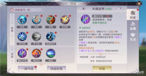 当我们到达灵虚境界后,就可以进行枪斧攻击模式之间的切换了。那我们就先来介绍下用于武器切换的两个技能,首先是横扫千军技能,根据名字就可以知道这个技能有着不俗的aoe伤害,更重要的是释放这个技能之后我们能够获得霸体效果,在1秒的时间里能免受控制同时减伤20%。因为武侠属于近距离输出职业,这个技能能够在关键时刻让我们免受boss控制。另外一个技能为断岳扫,效果与横扫千军基本相同,区别是前一个技能是将斧形态切成枪形态,后者正好相反。前面我们说到了武侠属于近身职业,但是他自身又没有妖兽那么能抗,因此,我们就更要注重位移技能的使用时机,比如虎跃技能。