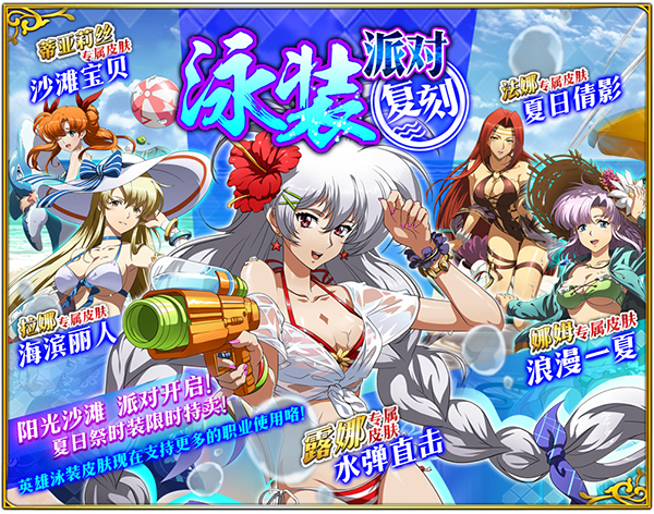 沙滩,大海,梦想,美少女正是人类的宝藏!艾露萨利亚迎来了最亮丽的风景线,不知是哪个曼妙的身形会映入眼帘,泳装皮肤限时复刻上架商城!春日回暖刚刚到来,少女们便迫不及待地拿出新装。青春靓丽的比基尼还有活泼可爱的死库水,无论哪一种都会将英雄的魅力充分展现给大家,哪一位的泳装最能触动你的心弦呢?