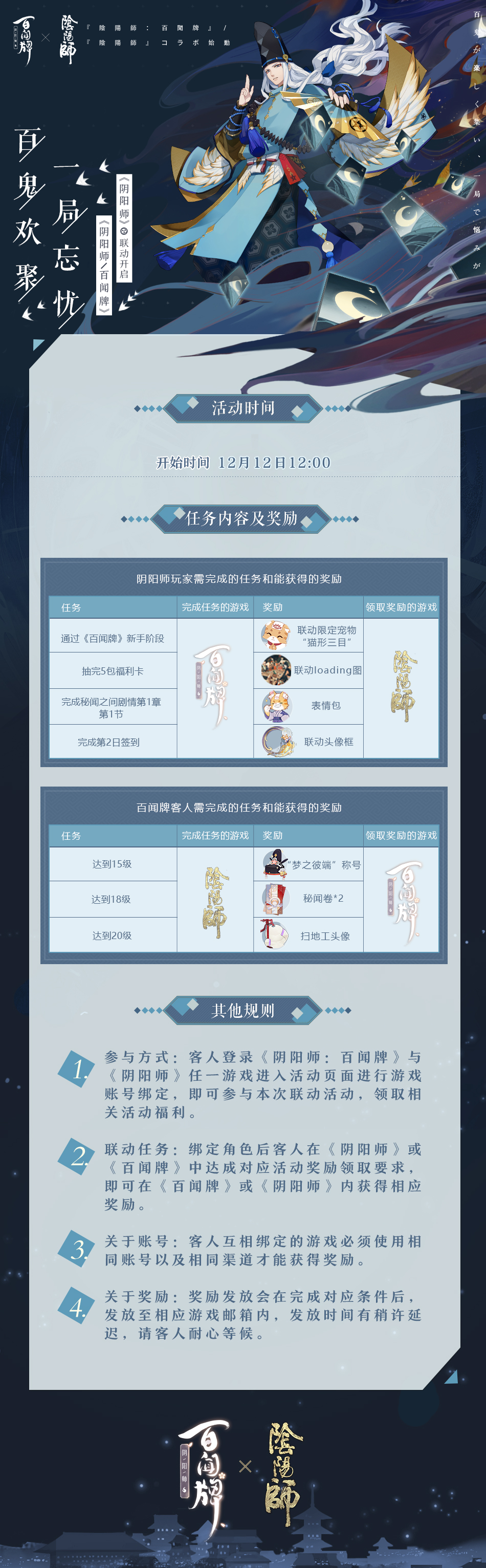直播的压轴大戏,三方游戏策划们向大家介绍了本次联动活动。此次联动福利将于12月12日《阴阳师:百闻牌》全平台上线当天12点正式开启,为三家游戏粉丝带去不容错过的惊喜。只要在《阴阳师:百闻牌》中完成新手阶段,抽完5包福利卡等内容,即可进入《阴阳师》领取联动限定宠物“猫形三目”、联动loading图等奖励;而在《阴阳师》中达成一定等级,分别可从《阴阳师:百闻牌》内领取“梦之彼端”称号、秘闻卷x2、扫地工头像。