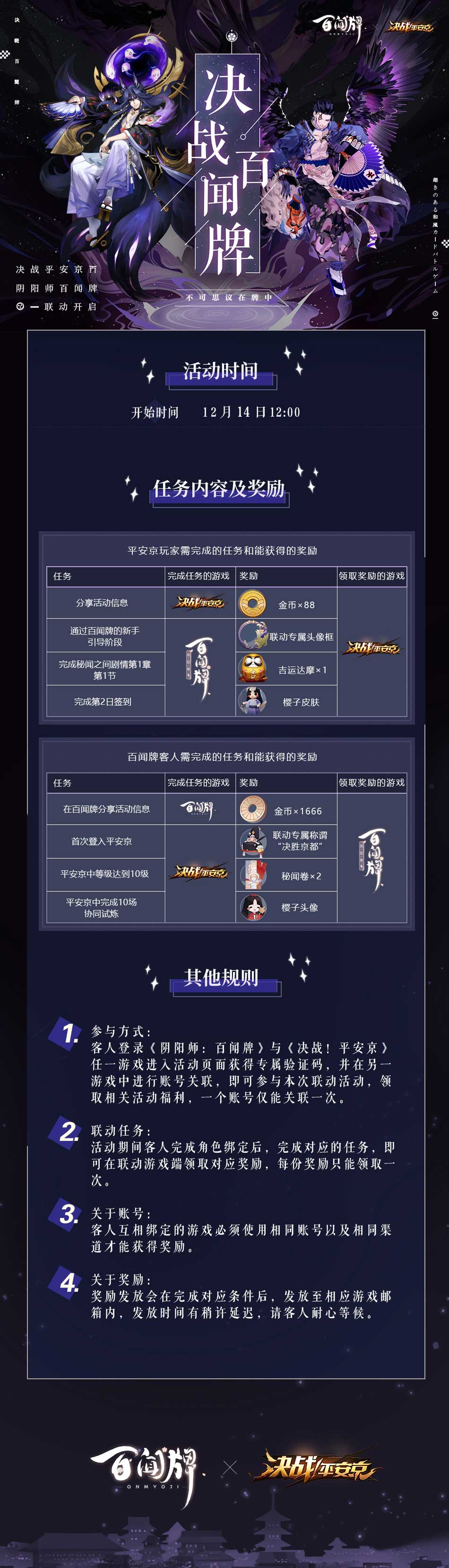 另一方面,《决战!平安京》与《阴阳师:百闻牌》的玩家。则可通过分享活动信息 ,分别获取金币x88,与金币x1666。只要通过《阴阳师:百闻牌》的新手引导阶段,完成秘闻之间的剧情第1章第1节等,就能进入《决战!平安京》得到移动专属头像框、吉运达摩等福利;或是在《决战!平安京》内登录,达成一定等级与协同试炼,便能得到《阴阳师:百闻牌》中的联动专属称谓“决胜京都”、秘闻卷x2与樱子头像。