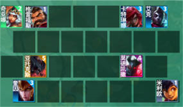 1:阵容由琪亚娜,艾克,米利欧,格雷福斯,奎因,莫德凯撒,卡特,剑魔组成的;