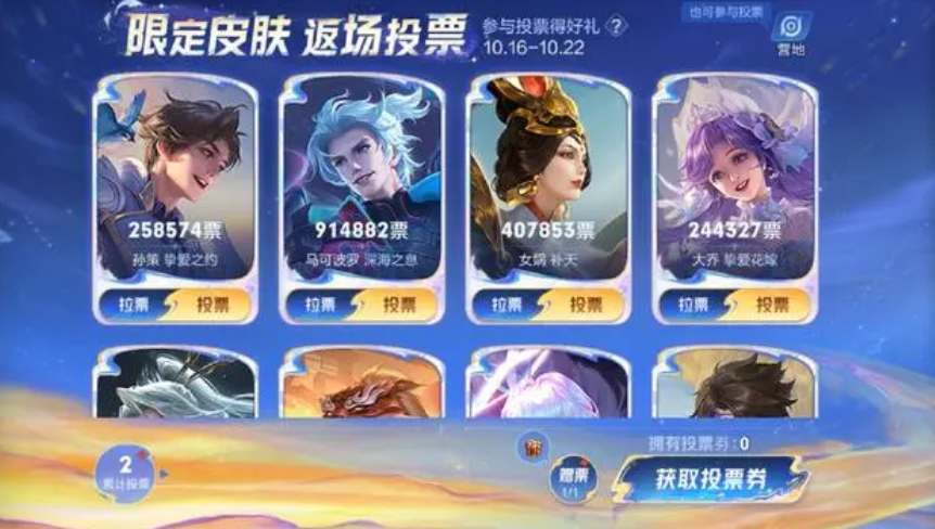 4、在投票活动结束之前返场名单还不能确定,等到10月22日投票结束后就可以得知最终获得票数最高的六款皮肤了。