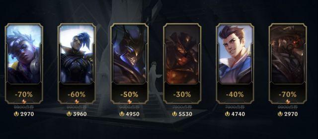 另一位玩家的:神王诺手,源计划烬,战斗学院杰斯,法外狂徒男枪,西部魔影卢锡安和敲钟牛。如果没有英雄的话皮肤里会有英雄的头像,代表折扣是英雄和皮肤加在一起的,这点需要格外注意,如果对折扣皮肤有意,那最好是先用精粹把英雄买了,不然会多花钱,很不合适。
