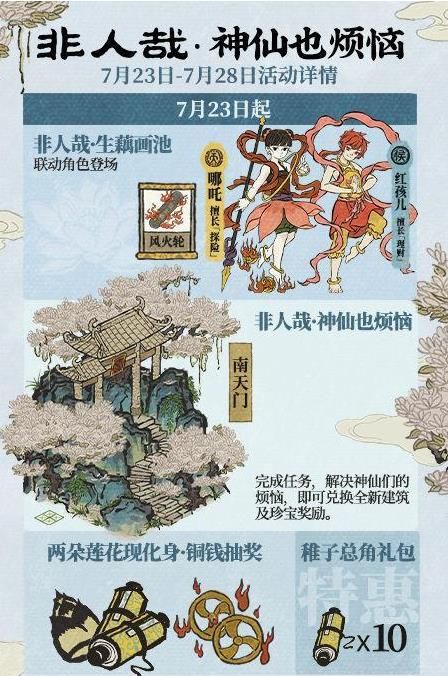 7月23日起,江南百景图将与非人哉展开系列联动活动,第一期联动居民 ——哪吒、红孩儿入住江南小镇!