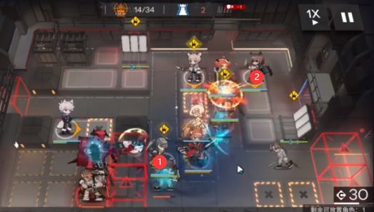 2.接着攒够一波费下术师(史都华德)针对左侧高物防单位,然后上群狙输出。左边怪开始移动时洁哥第二次开启反重力输出。