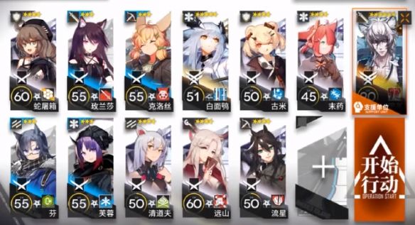 1.如下图所示,开局先锋+桃金娘(堵路+回费),费用足够后上群攻近卫输出,然后补上安洁莉娜和单奶。
