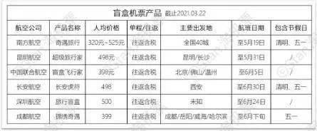 3月中旬,各大航司、在线平台都在纷纷发布盲盒相关的产品,中国联航、深航、华夏航空、南航、山航等纷纷销售盲盒机票等来刺激小长假市场的复苏。