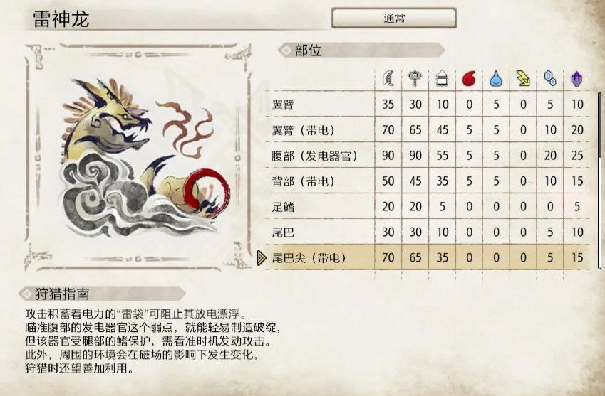 弱点部位(按效果排序): 腹部(发电器官)、翼臂(带电)、头部、尾巴尖(带电)、胸部(带电)