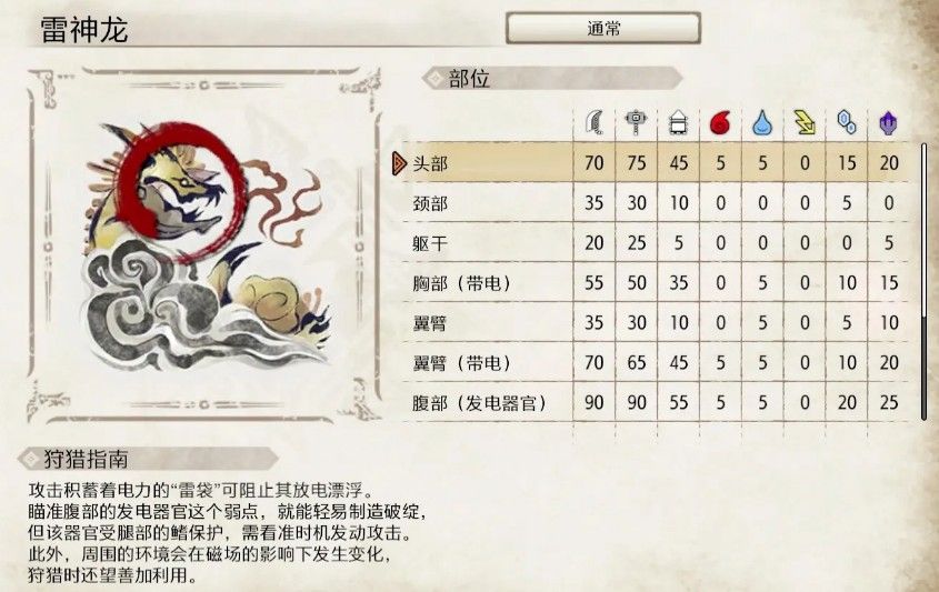 弱点部位(按效果排序): 腹部(发电器官)、翼臂(带电)、头部、尾巴尖(带电)、胸部(带电)